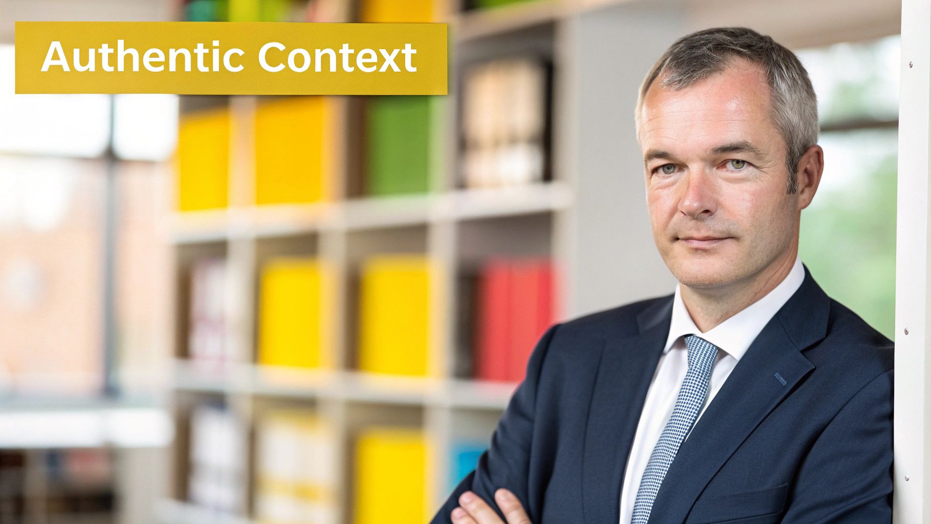 Using a softly blurred office or workplace environment as your background provides context about what you do without being distracting. This technique, often called an "environmental portrait," creates an image that feels authentic and tells a story about your profession. This makes it an excellent choice for architects, consultants, and executives who want to connect with their audience on a deeper level.