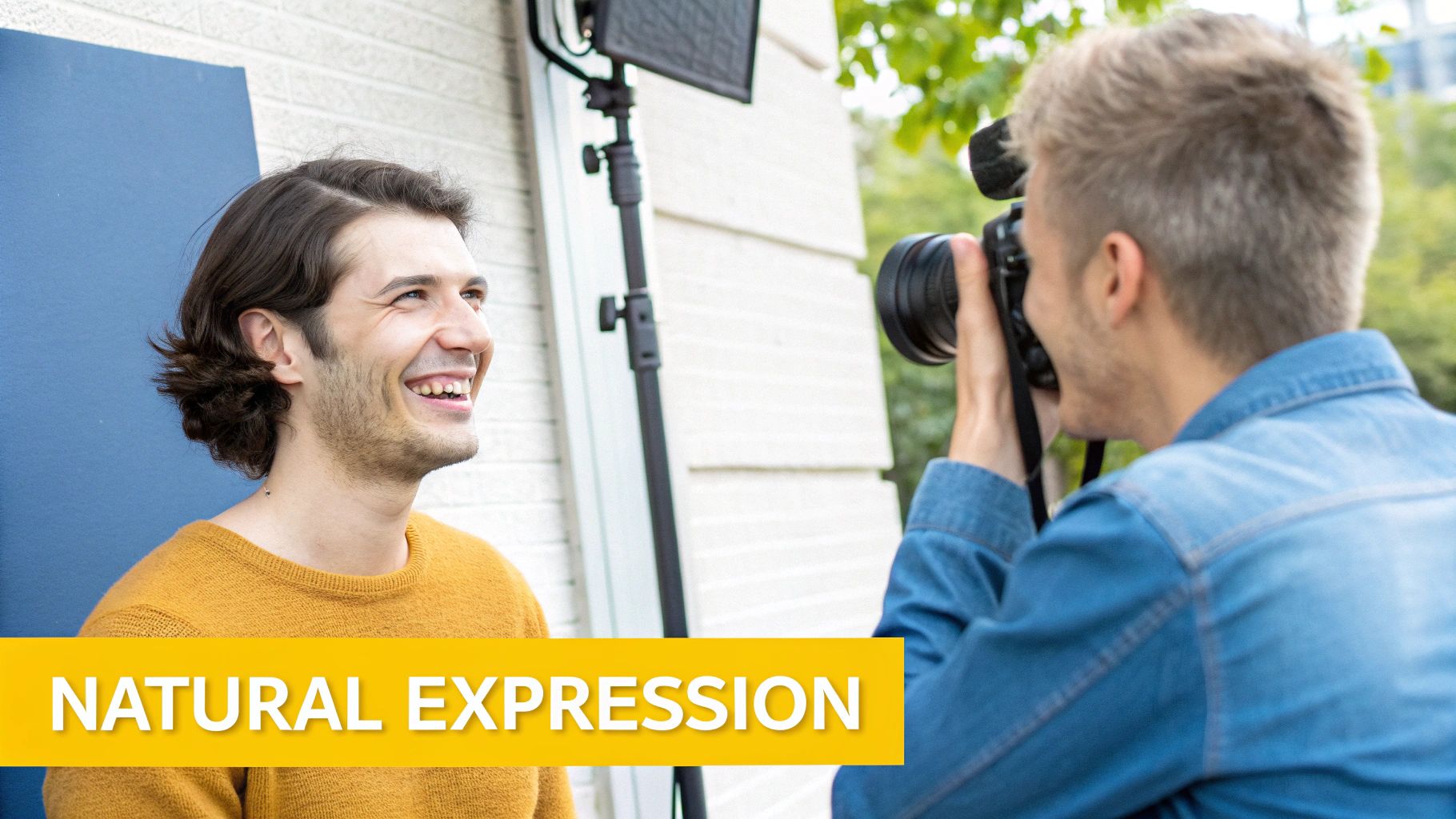 The old advice to "say cheese" doesn't work for professional photos. A forced smile often looks stiff, but a genuine smile communicates warmth and builds instant trust. The same goes for eye contact. Looking directly into the lens creates a powerful sense of engagement and shows self-assurance.